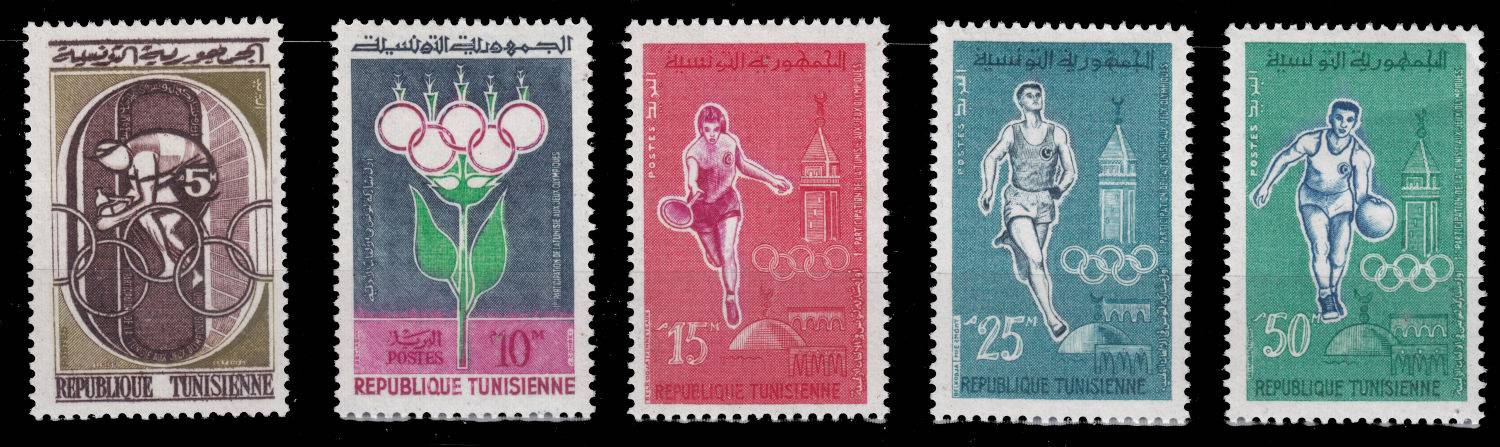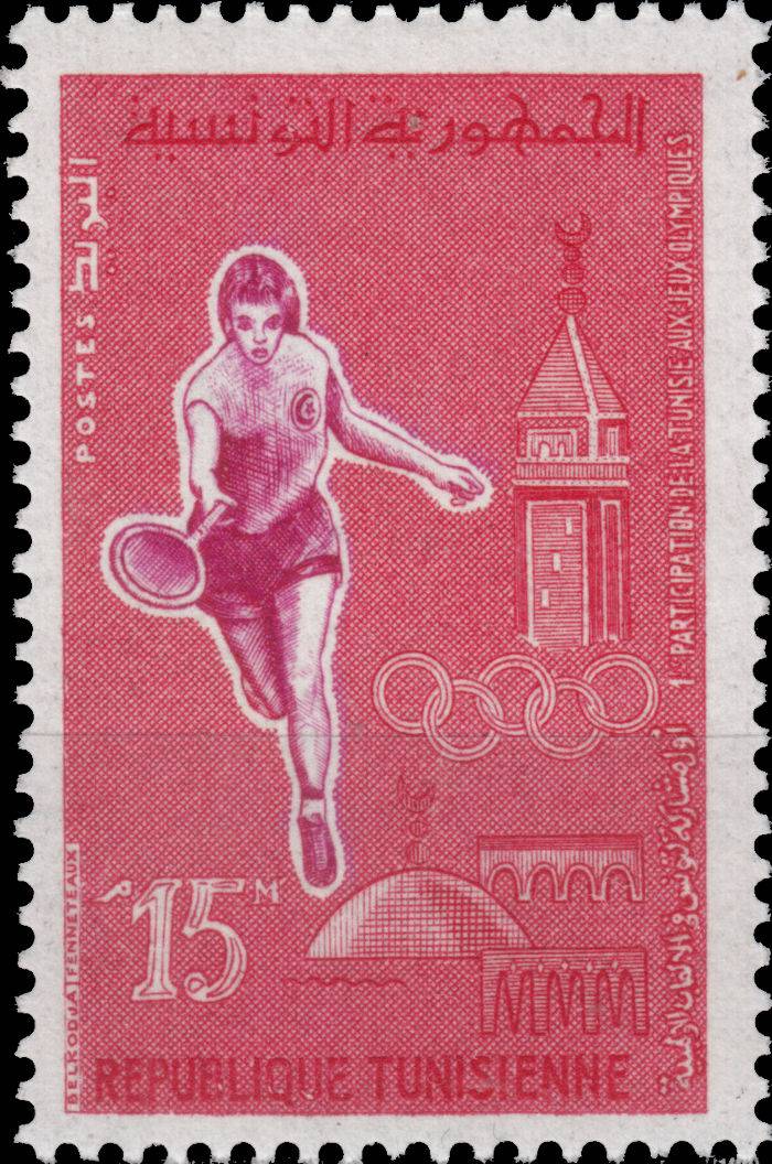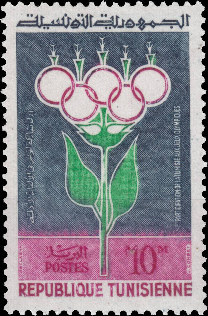 besitzt außerdem olympische Ringe und die Aufschrift REPUBLIQUE TUNISIENNE und den jeweiligen
