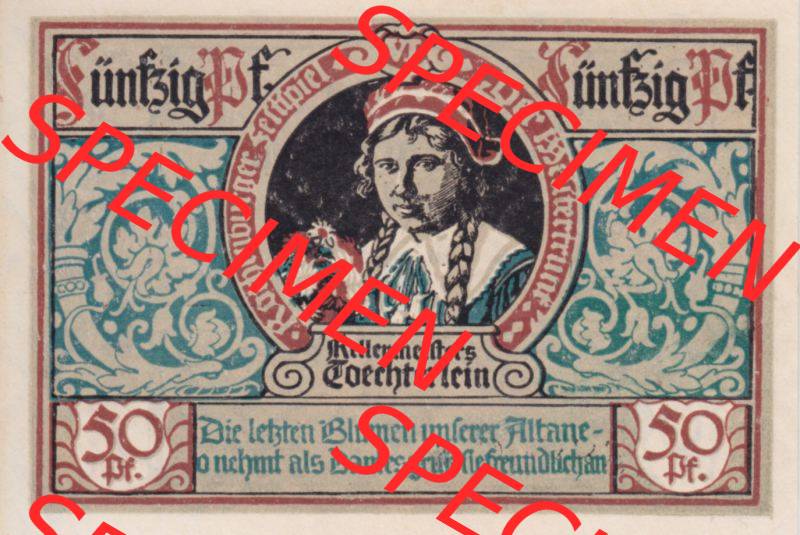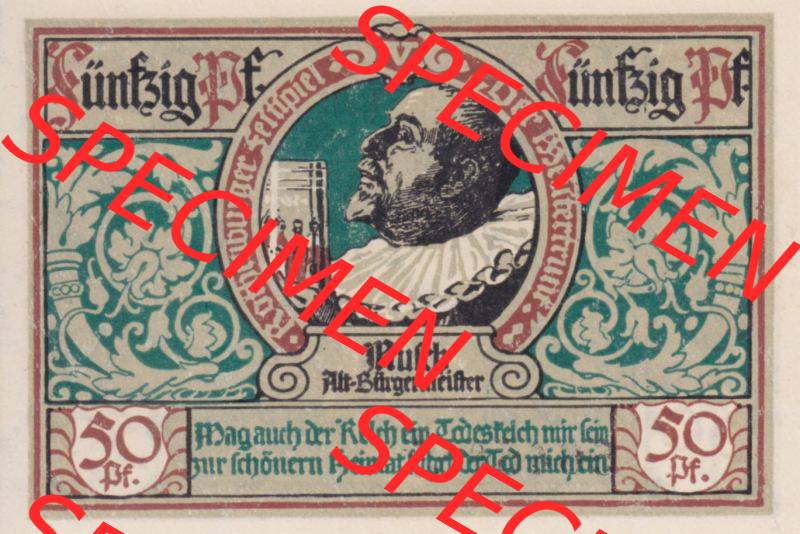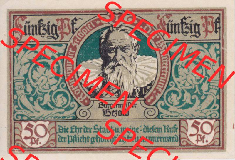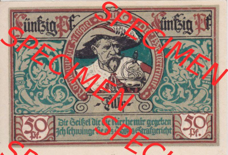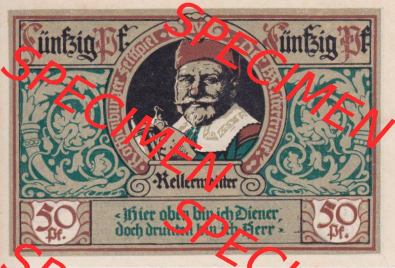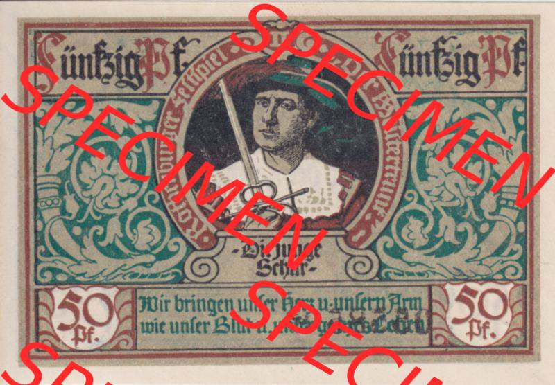 von 50 Pfennig bzw. Fünfzig Pfennig. Das Motiv auf den Serienschein sind