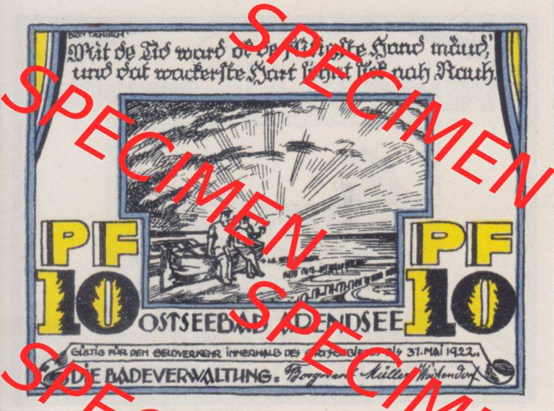 Rückseite des 10 Pfennig Reutergeld-Scheins befindet sich ein Paar am Strand des Ostseebades