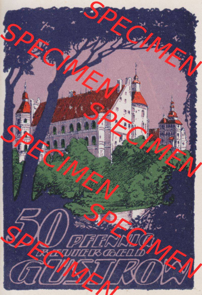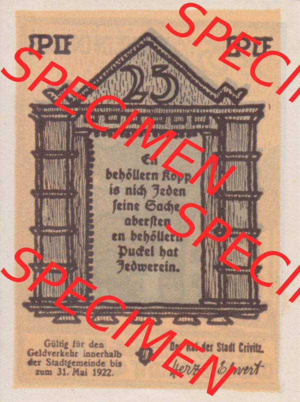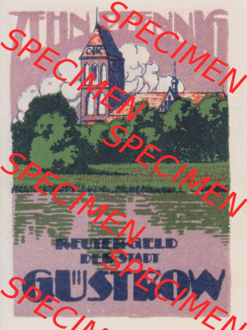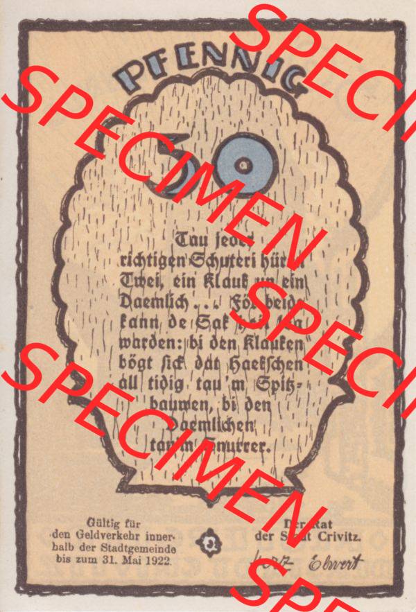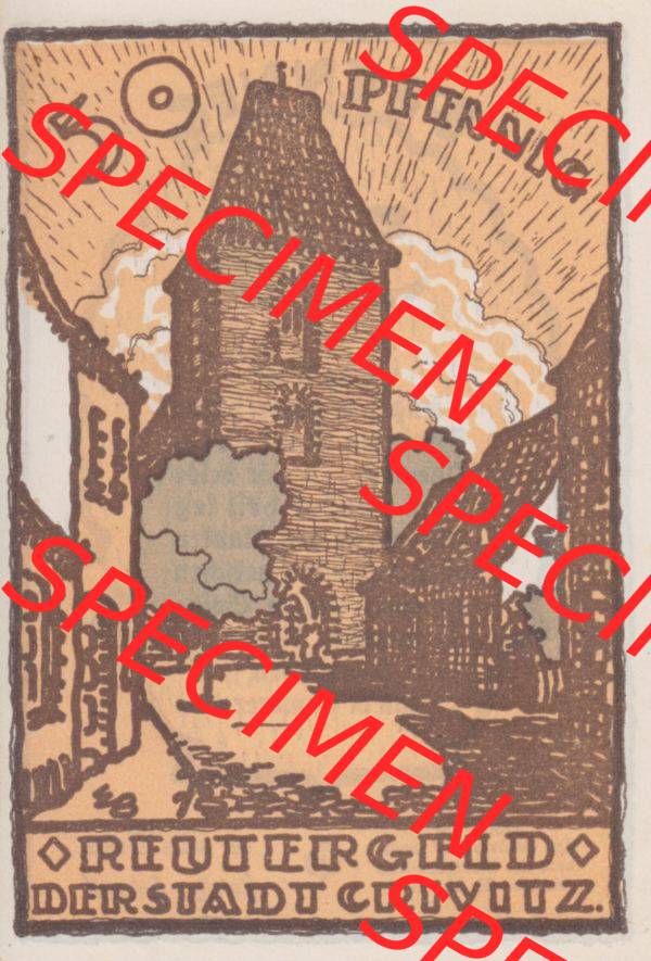 Vorderseite ist wie beim 10 Pfennig-Schein eine Gezeichnete Stadtansicht der Stadt Crivitz