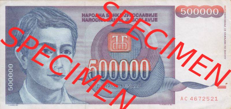 Bundesrepublik Jugoslawien 1993 Wert 500000 Dinar, mit einem Jungen Mann auf der Vorderseite und