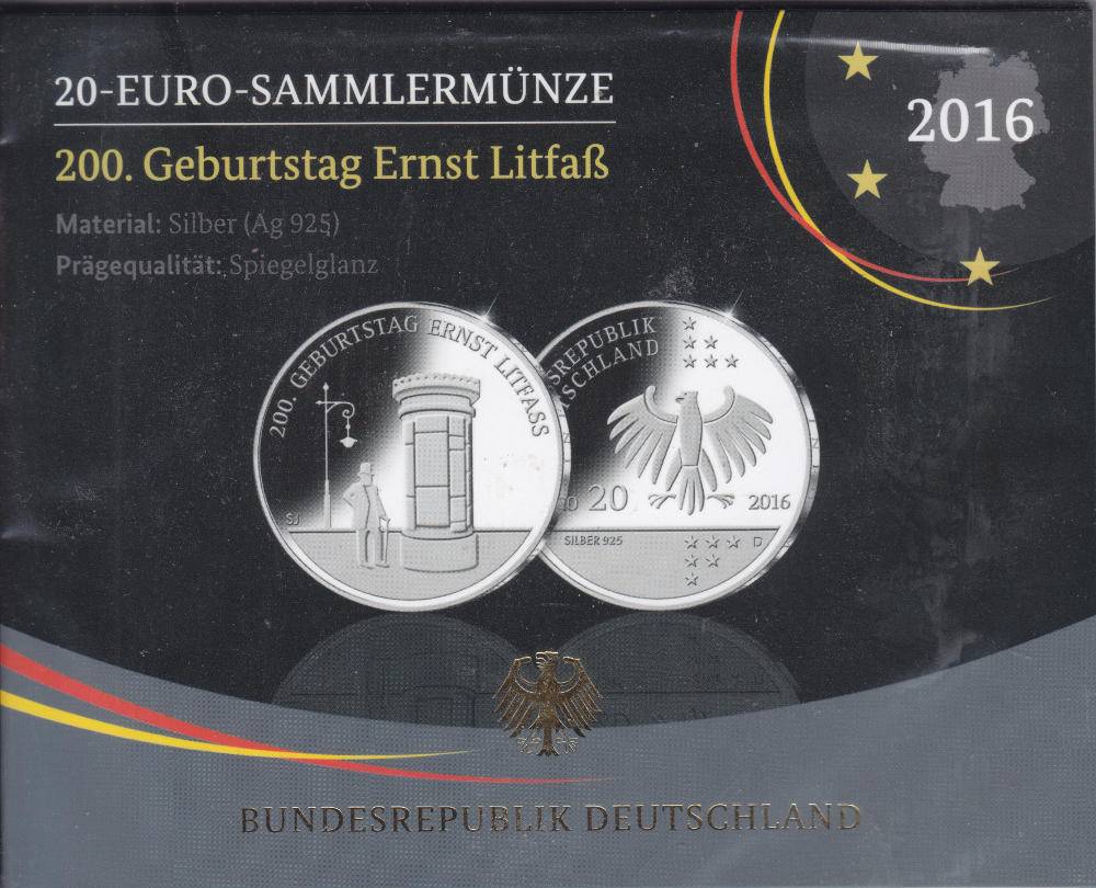 20 Euro Sammlermünze / Gedenkmünze 2016 200. Geburtstag Ernst Litfaß