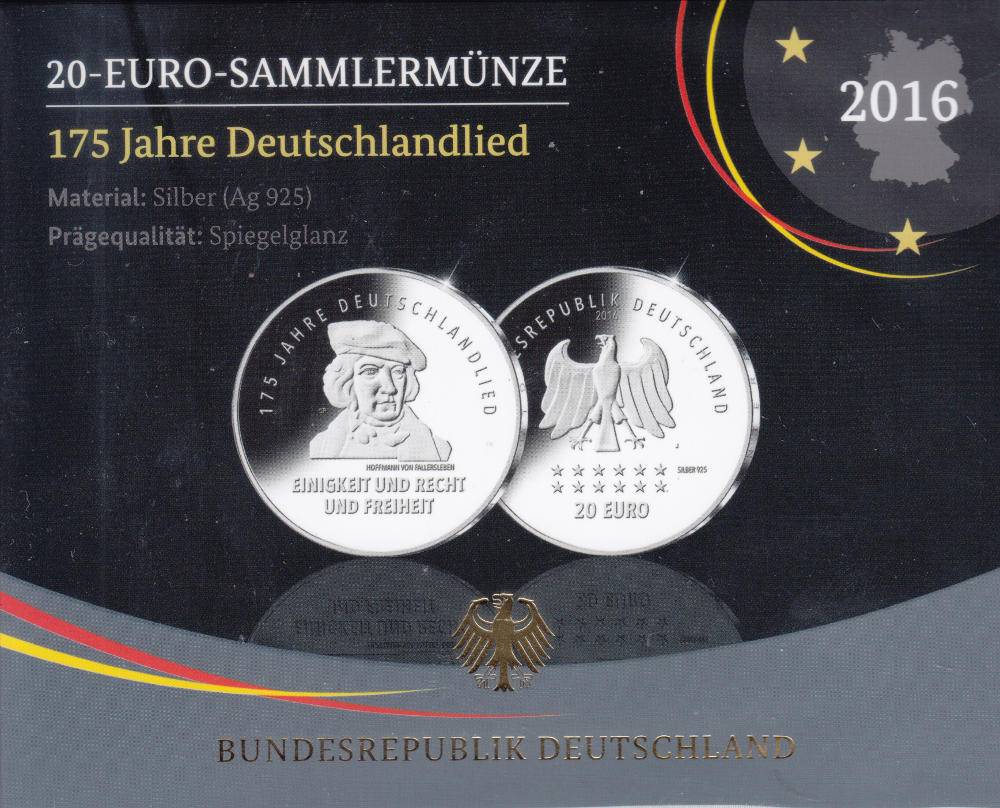 20 Euro Sammlermünze / Gedenkmünze 2016 175 Jahre Deutschlandlied. Motiv ist
