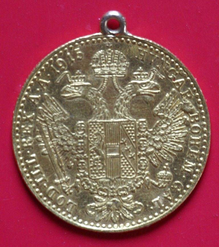 Siehe hier Österreich Dukaten, wenn die Münze einen Durchmesser von 19,75 mm besitzt dann ist es ein 1-fach Dukat und beim Durchmesser von 39,5 mm ein 4-fach Dukaten. Der Jahrgang 1915 ist eine offizielle Neuprägung, das bedeutet die Goldmünze wurde in den Jahren nach 1915 geprägt und besitzt nur den Goldwert als Wert und keinen Sammlerwert und mit der Öse ist die Münze Beschädigt, damit ist die Goldmünze etwas weniger Wert als ohne Öse :!: Aber was hauptsächlich Zählt ist dass Goldgewicht und der damit verbundene Aktuelle Börsen-Goldpreis. Es handelt sich um Börsengold damit ist die österreichische Goldmünze in Deutschland und Österreich von der Mehrwertsteuer befreit, womit der Preisunterschied zwischen Verkauf und Ankauf relativ gering ausfällt.