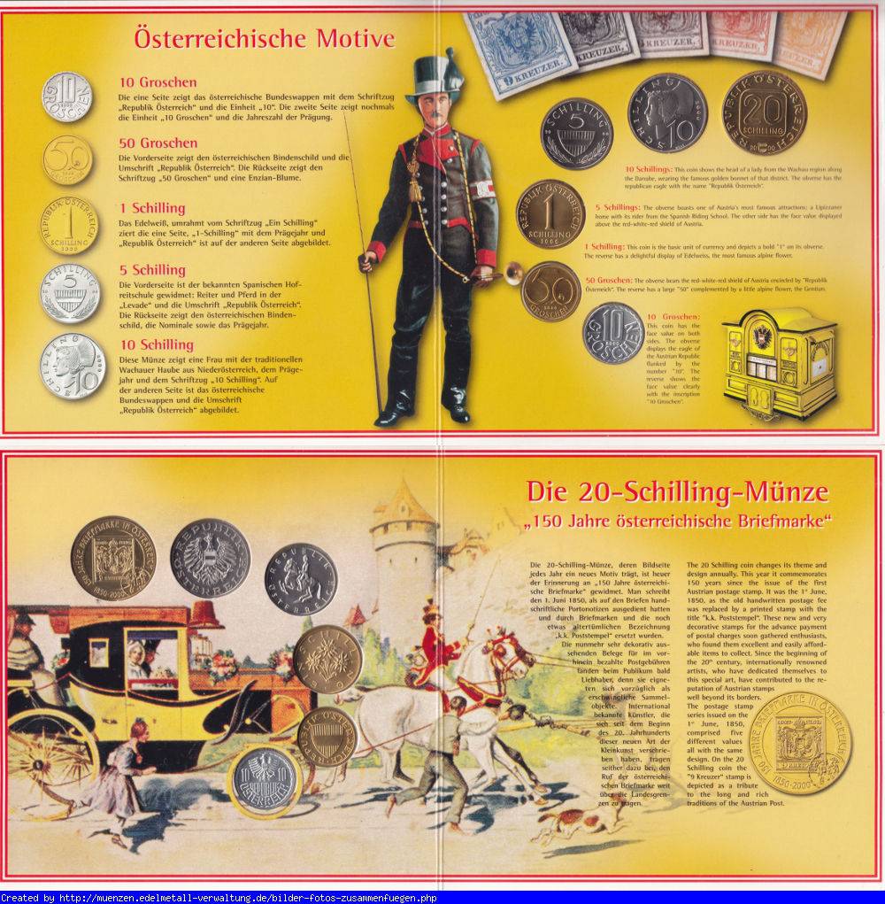 "150 Jahre österreichische Briefmarke". Enthält 6 Münzen zum