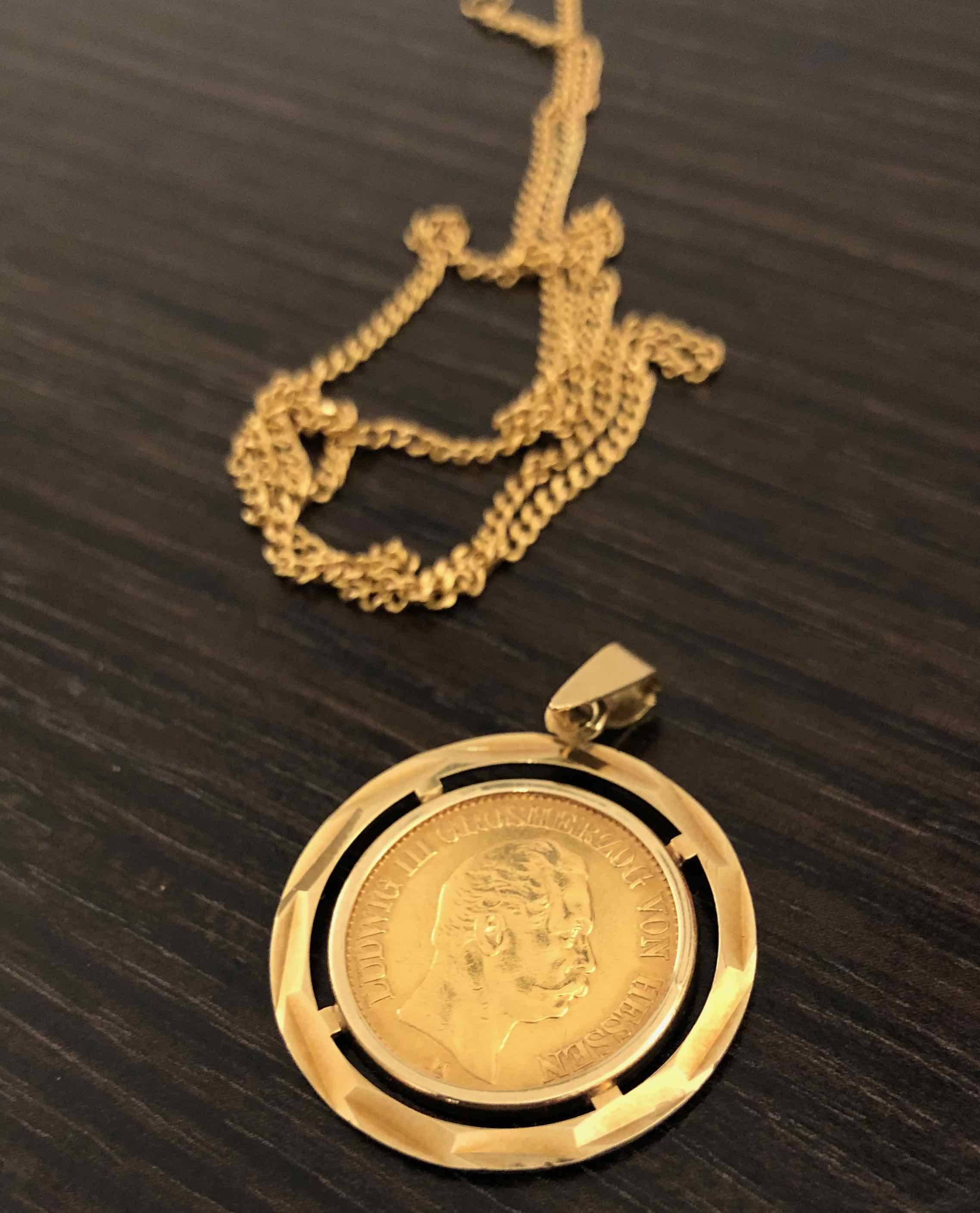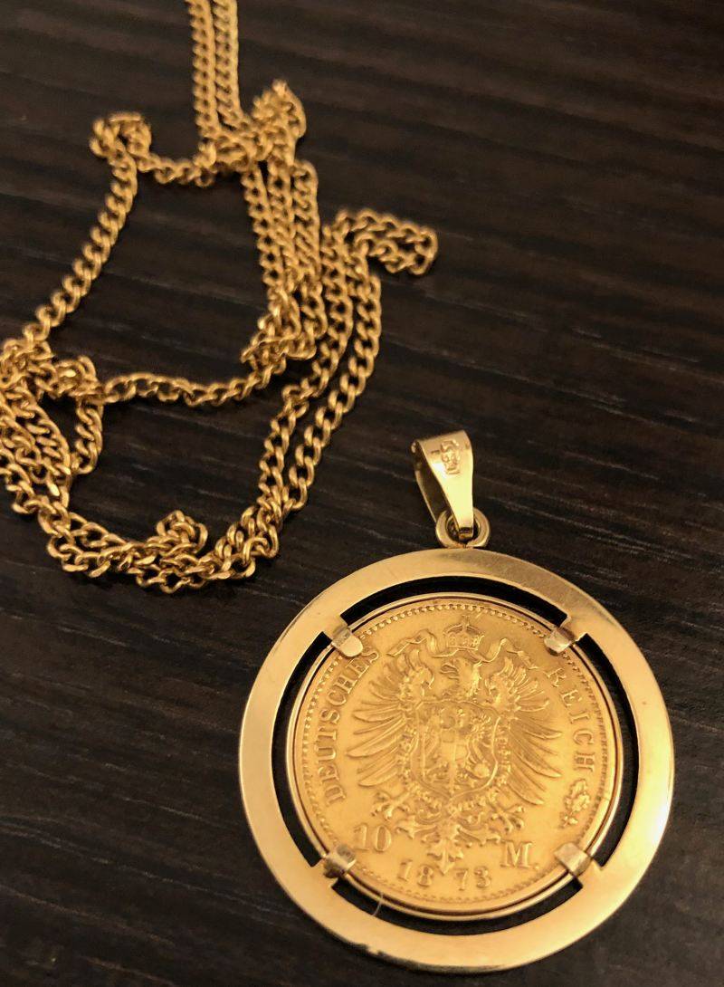 die 10 Goldmark Münze in einer Fassung eingebracht wurde und damit beschädigt ist,